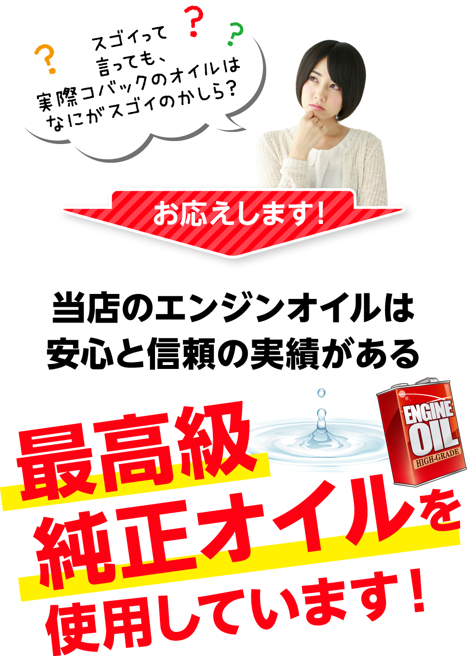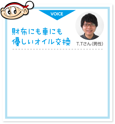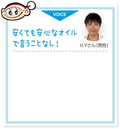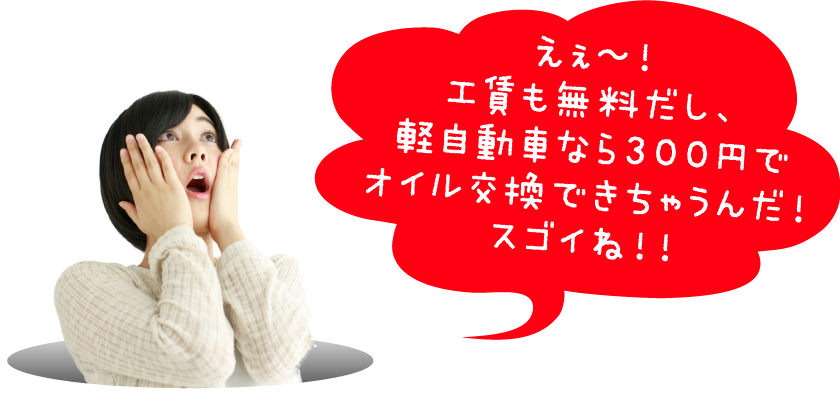 オイル交換って意外に高いし、頻繁に変えなきゃいけないからいつももったいないと思っていました。でもグレードが低いオイルは故障の原因になっても嫌だし…でもコバックの100円オイルに出会って、ハイスペックなオイルなのに安い!ハイスペックだから車にも優しいし!もう財布を気にすることなくオイル交換に行けてラッキーです!